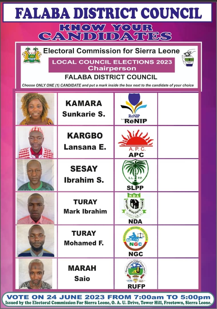 Finally in the battle for the councillorship position in the Falaba District four political parties will be running. Below is the list of candidates: