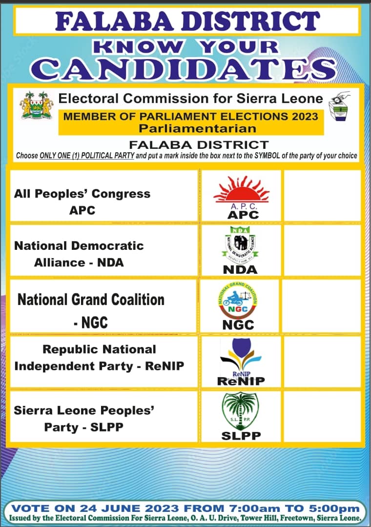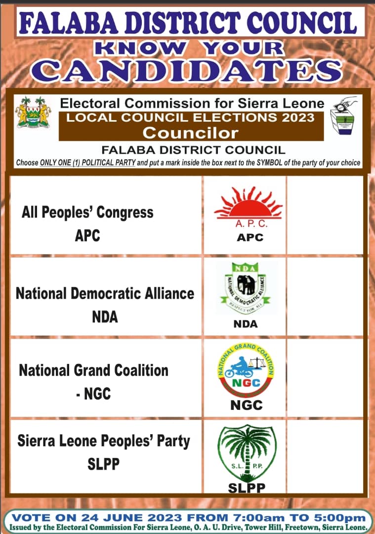 The Electoral Commission of Sierra Leone has set the stage for candidates at the Falaba District to contest in the June 24 2023 general elections. Using the PR System the candidates will showcase their might in a who versus who battle for the seats at the Falaba District.