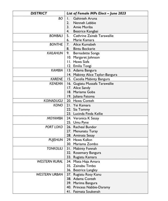 The June 24 general elections results showed a large number of female Members of parliament with 41 female MPs elected to represent constituencies across the country. A commentator on Social media referred to it as the largest women’s caucus in the history of Sierra Leone’s Parliament and he prays that they focus on the real issues affecting women and not party agendas.