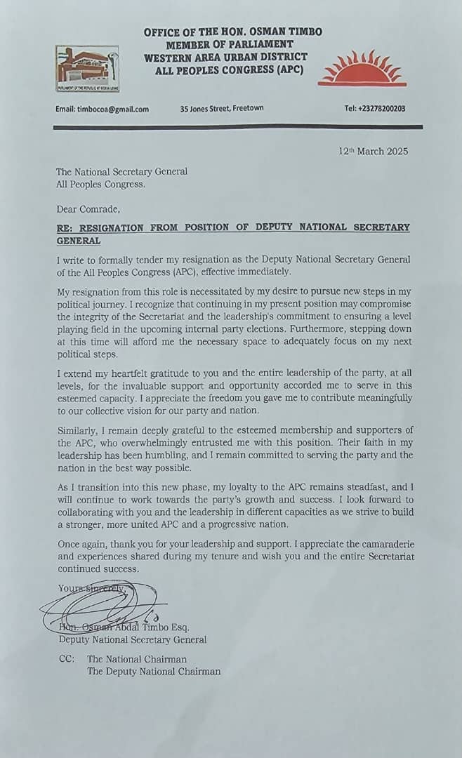 Hon. Osman Abdal Timbo Esq. has resigned from his position as the Deputy National Secretary General of the All Peoples Congress (APC), effective immediately.