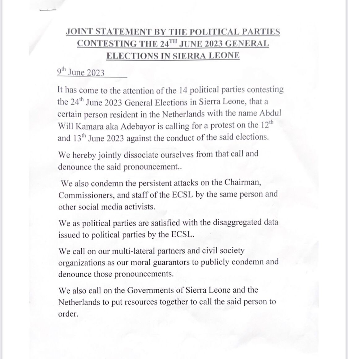 A statement from 14 political parties reads that they disassociate themselves from the protest of a Sierra Leonean called Abdul Will Kamara aka Adebayo on the 12th and 13th June 2023.