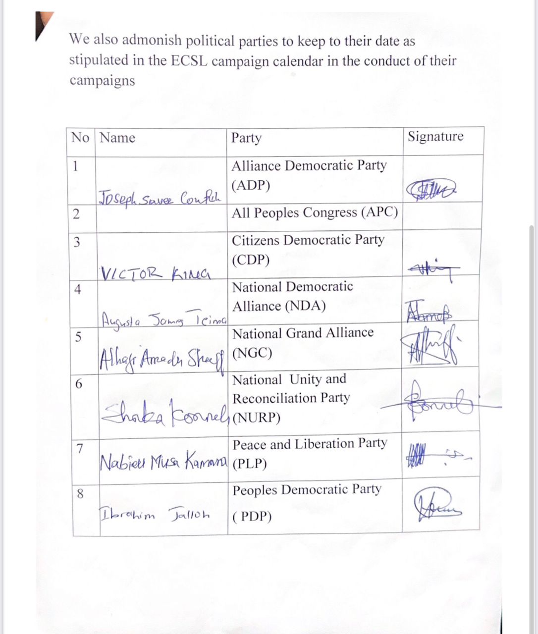 In the end of the statement which all the 14 political parties signed to, they admonish political parties to keep to their date as stipulated in the ECSL campaign calendar in the conduct of their campaigns.