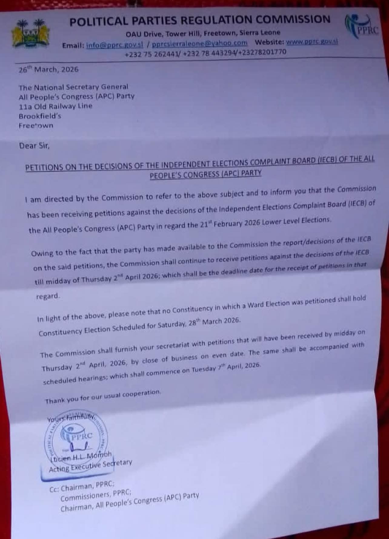 The Political Parties Regulation Commission (PPRC) has suspended all constituency elections scheduled for Saturday, 28th March 2026, in areas where ward-level results have been formally challenged, following a wave of petitions against the internal dispute resolution mechanism of the main opposition All People’s Congress (APC) party.
