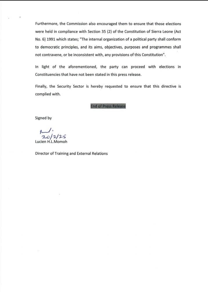 The Commission emphasized that this decision aligns with its constitutional and statutory mandate to ensure compliance with the SLPP Constitution of August 11, 2020, and the party’s February 5, 2021, Rules and Regulations for Executive Elections.