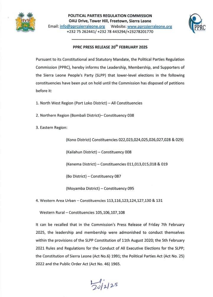 In a press release issued on February 20, 2025, the PPRC announced that all constituencies in Port Loko District (North West Region) and several others in the Northern, Eastern, and Western regions are affected by the suspension.