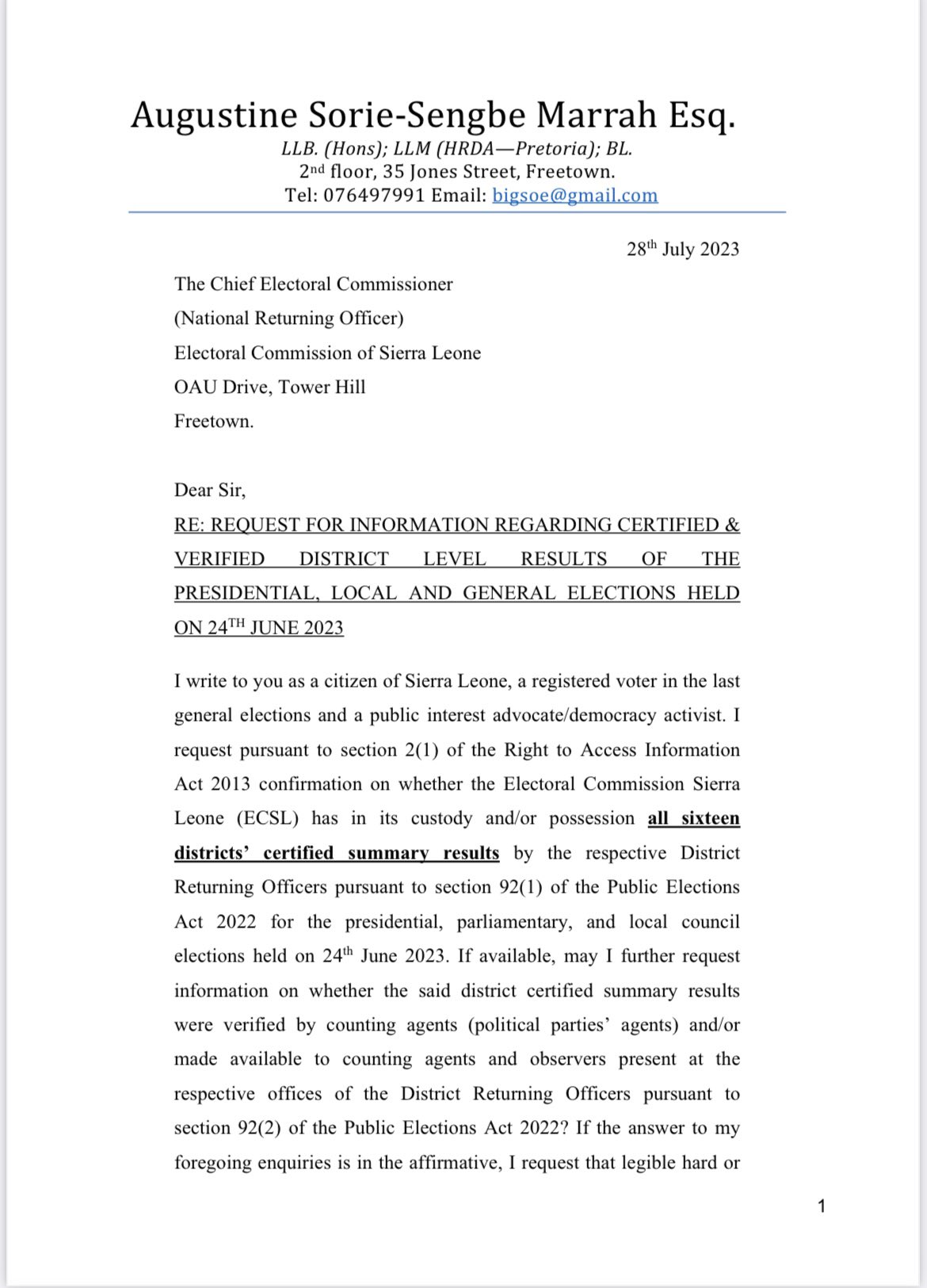 In the letter he requested as a citizen of the country for the ECSL to confirm whether the commission possesses all sixteen districts’ certified summary results. He said, “I write to you as a citizen of Sierra Leone, a registered voter in the last general elections, and a public interest advocate democracy activist. I request pursuant to section 2(1) of the Right to Access Information Act 2013 confirmation on whether the Electoral Commission Sierra Leone (ECSL) has in its custody and/or possession all sixteen districts’ certified summary results by the respective District Returning Officers pursuant to section 92(1) of the Public Elections Act 2022 for the presidential, parliamentary, and local council elections held on 24th June 2023.”