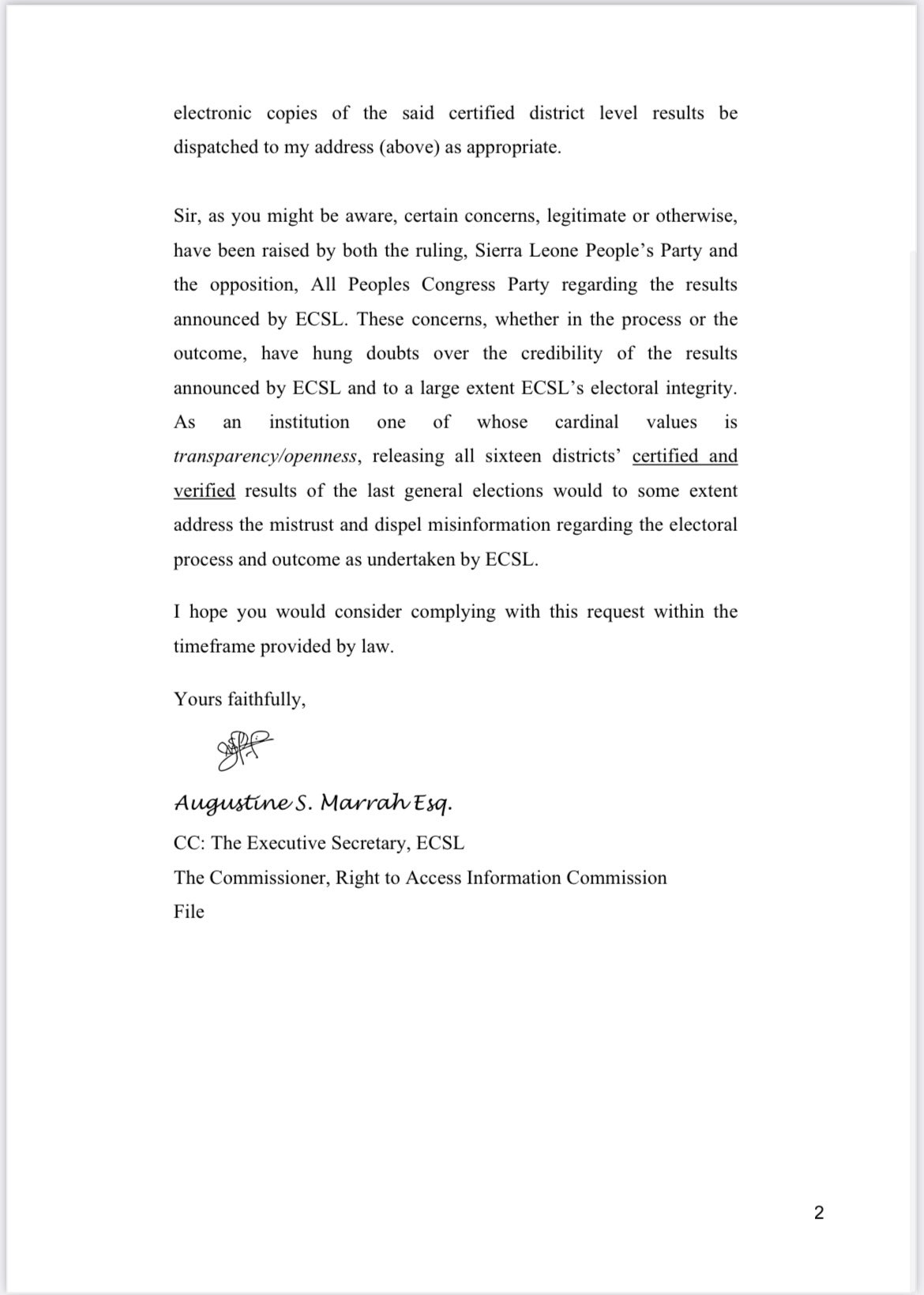 To garner more attention and validate his actions, Lawyer Augustine Sorie-Sengeh Marrah took to his Twitter handle to publish the open letter addressed to the Electoral Commission of Sierra Leone (ECSL) regarding the confirmation of the District Compilation of the June 24 general elections results.