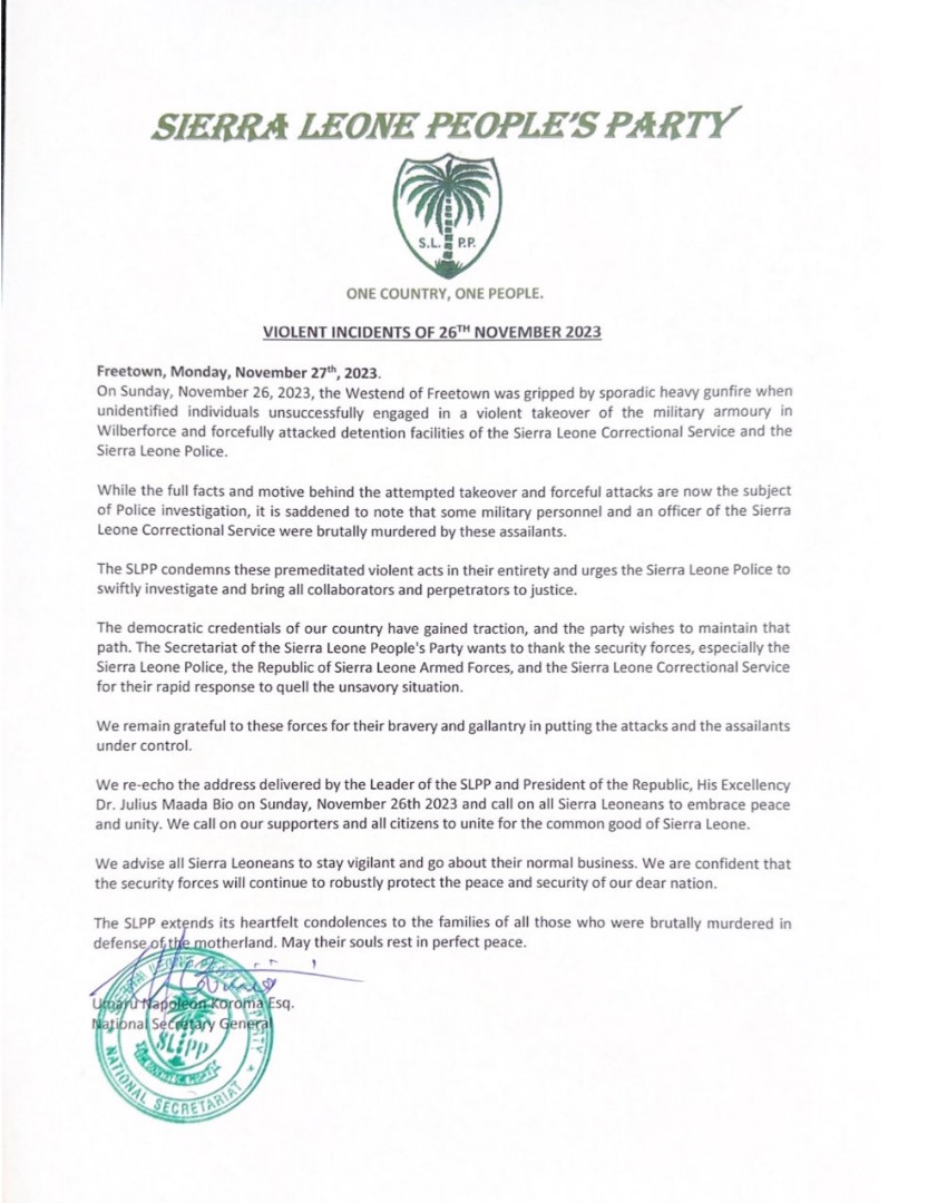 The SLPP noted the democratic gains the country has enjoyed over the years, adding that the party wishes to maintain that path. It thanked the security forces, especially the Sierra Leone Police, the Republic of Sierra Leone Armed Forces, and the Sierra Leone Correctional Service for their rapid response to quell the unsavory situation.