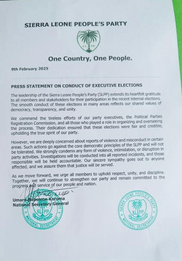 In a statement issued by the SLPP National Secretary General, Umaru Napoleon-Koroma, the party applauded the efforts of its executives, the Political Parties Registration Commission (PPRC), and all those involved in organizing and supervising the elections. The dedication of these individuals, he noted, ensured a fair and credible process that reflects the true spirit of the SLPP.