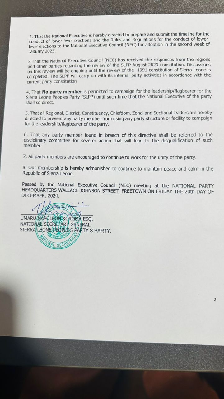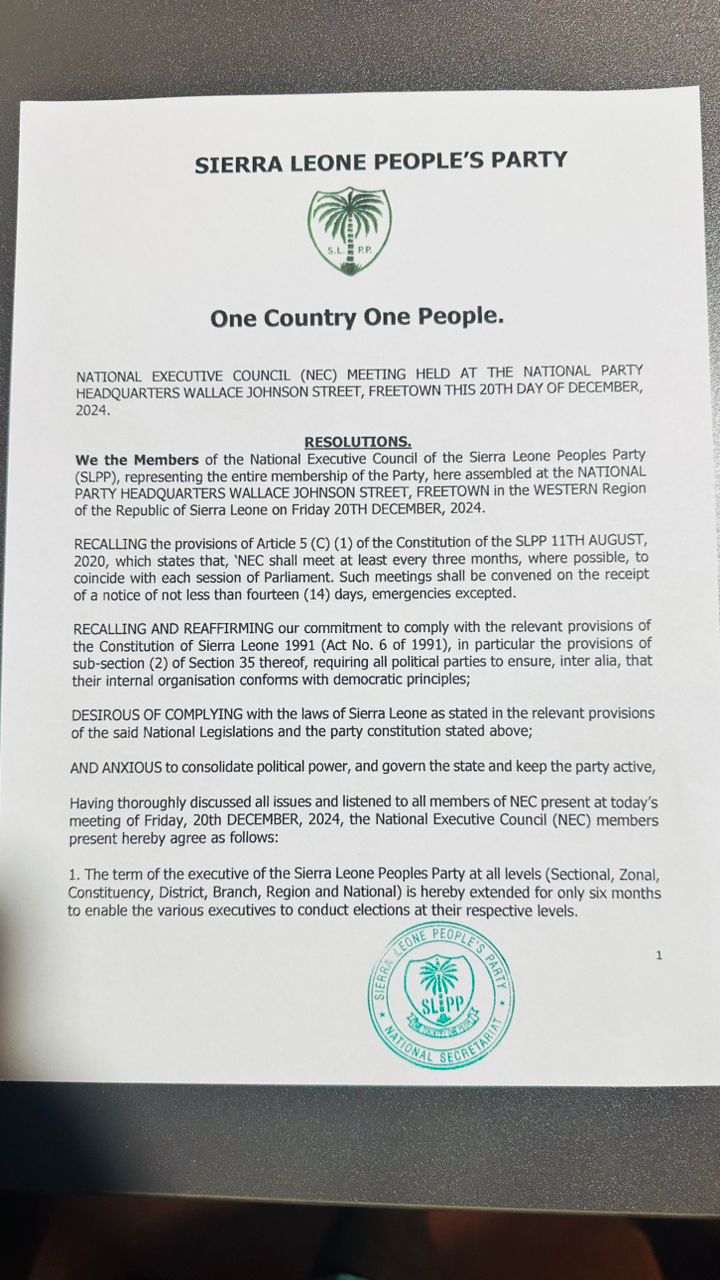 The resolutions were signed and issued by Umaru Napoleon Koroma Esq., the National Secretary-General of the SLPP.