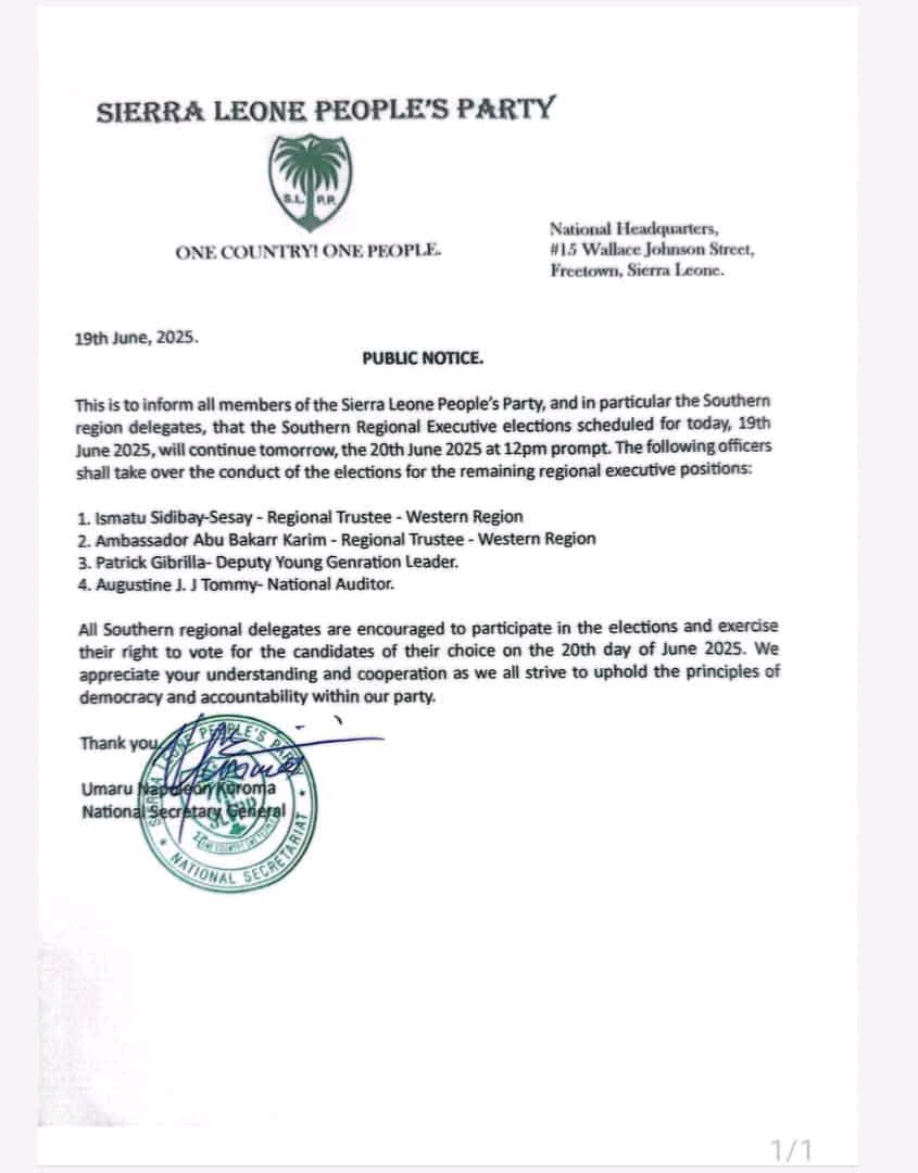 The elections, originally scheduled for June 19, were paused and are set to resume at 12pm on June 20 in Bo. The National Secretary General of the SLPP, Umaru Nape Koroma, has called on all Southern regional delegates to take part and vote for their preferred candidates.