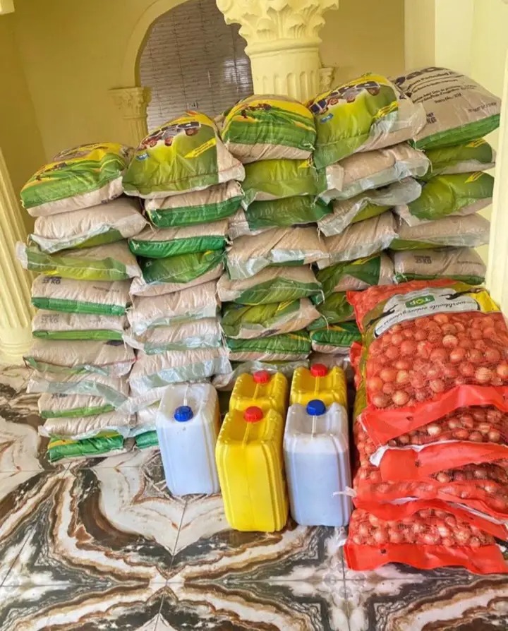The donation includes 50 bags of rice, onions, and cooking oil, aimed at supporting party faithfuls during the festive season.