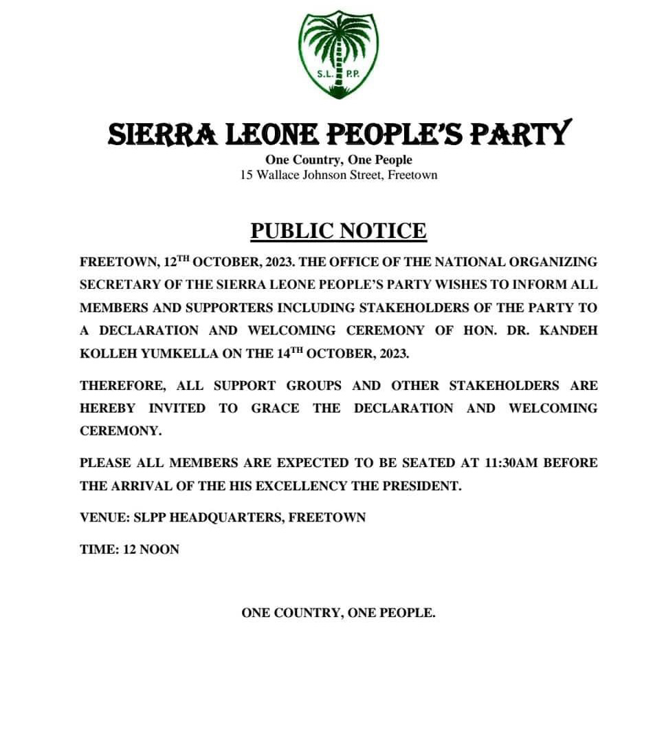 The stage is set for a grand declaration and welcoming ceremony, scheduled for tomorrow, the 14th of October, 2023, right at the SLPP headquarters in Freetown.