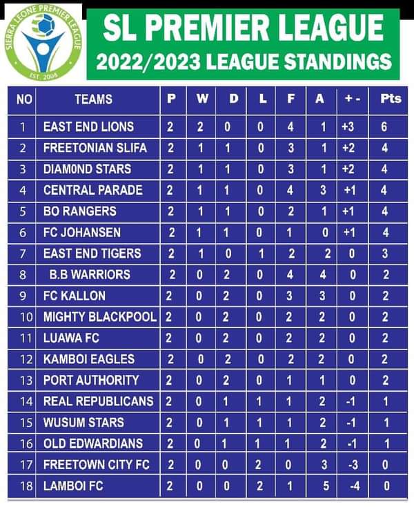 With the season just starting, week one recorded 19 goals in total. Kamboi Eagles, Mighty Blackpool, Wusum Stars, FC Johansen Bai Bureh Warriors and Real Republicans and their counterparts survived with a draw at their first appearances in the league. This left East End Lions (The Killers) with a confortable win against Lamboi FC at Lungi; Central Parade and Diamond Stars secured 3 points from their opponents.