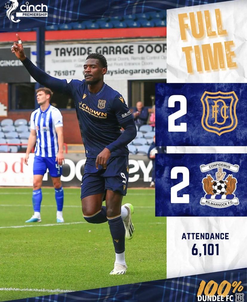 Sierra Leone Striker Amadou Bakayoko was on the Score Sheet as ten-man Dundee Football Club held a home draw against Kilmarnock FC on Saturday, 23 September 2023.