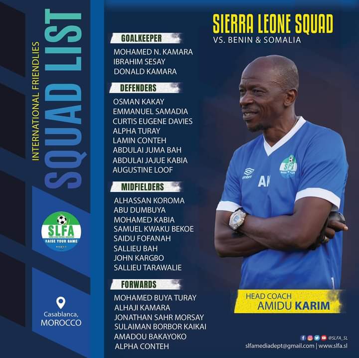 Sierra Leone’s national football team, Leone Stars, under the guidance of head newly appointed  head coach Amidu Karim , has revealed their squad consisting of 25 players.
