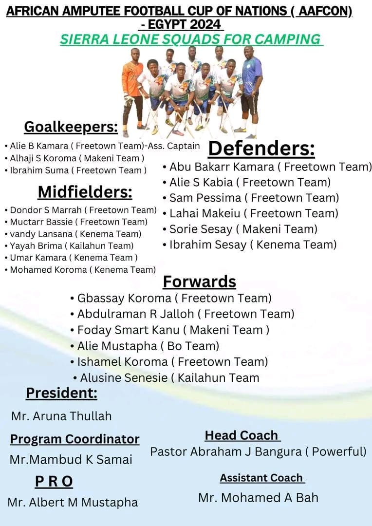 The Head Coach of Sierra Leone Amputee Football Team, Abraham J. Bangura has announced his 21-man squad ahead of Africa Amputee Football Cup of Nations in Egypt.