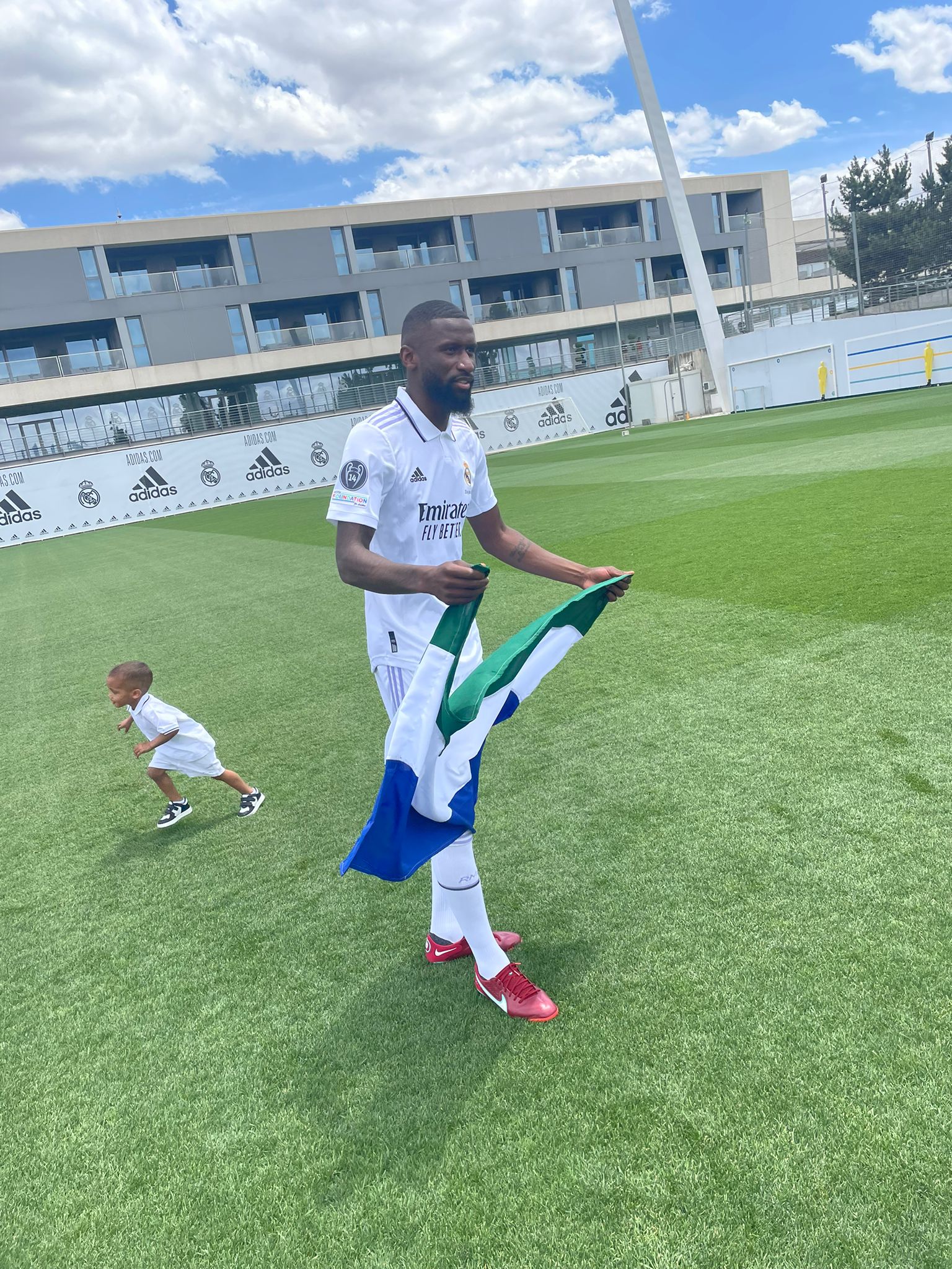 Sierra Leone’s Brand Global Football Ambassador, Antonio Rudiger has displayed the Sierra Leone’s National flag during his official unveiling ceremony at Real Madrid Football Club.