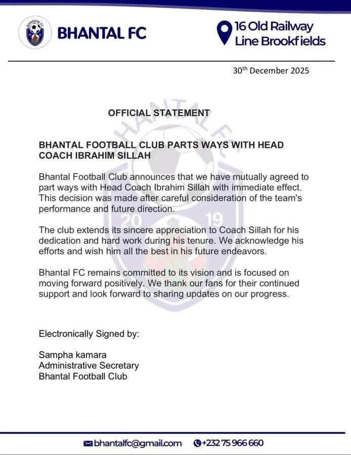 “Bhantal Football Club extends its sincere appreciation to Coach Sillah for his dedication and hard work during his tenure,” the statement read. “We acknowledge his efforts and wish him all the best in his future endeavors.”