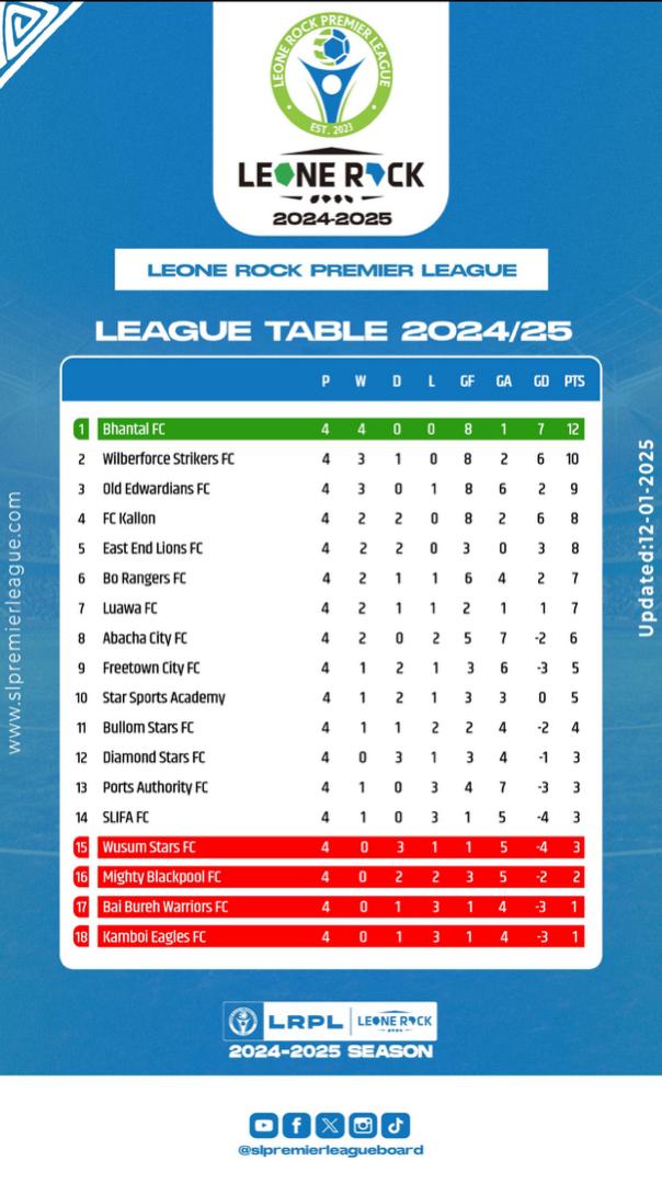 However, the bottom of the table presents a different picture. Kamboi Eagles, Bai Bureh Warriors FC, and Mighty Blackpool FC are struggling to find their footing, with only 1 point each after four games. Wusum Stars FC joins them in the relegation zone, having yet to secure a win and accumulating just 3 points.