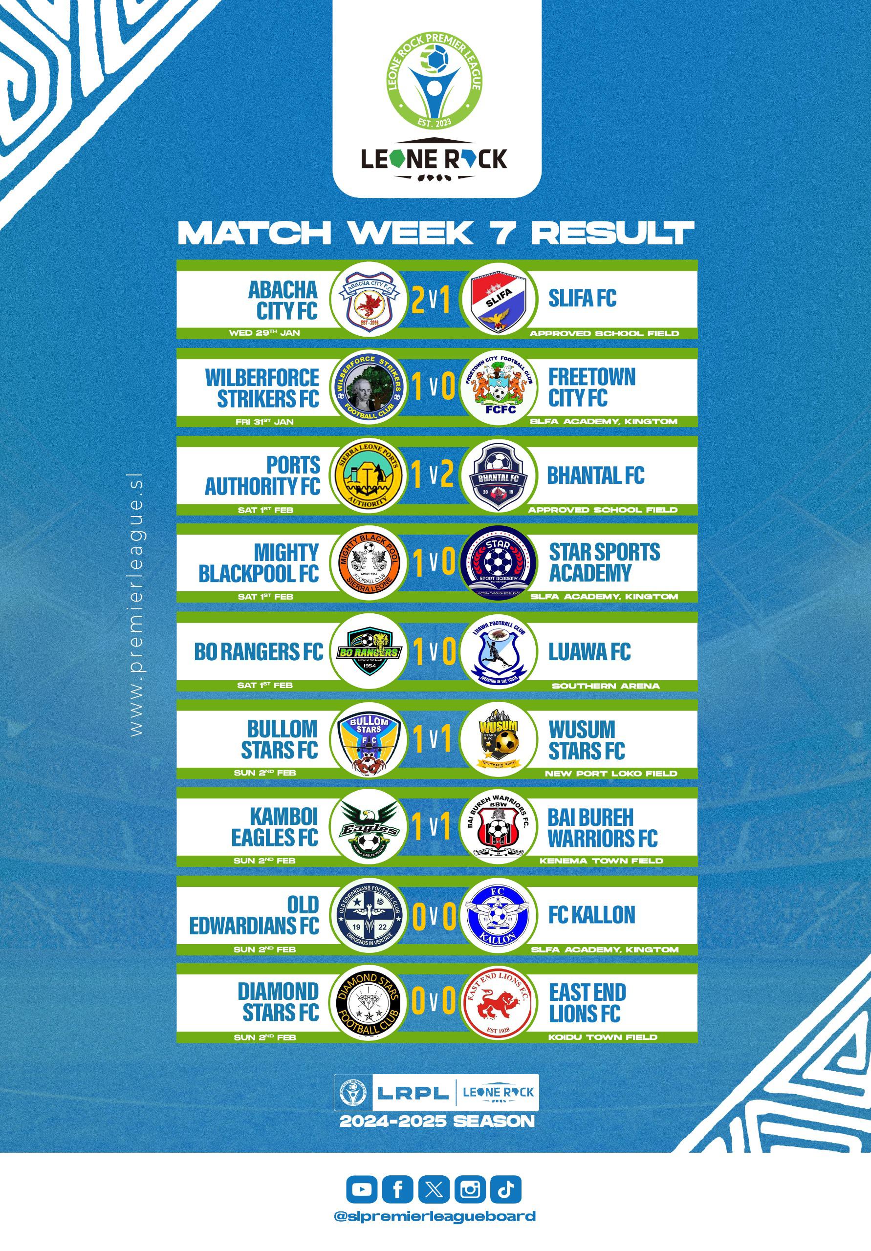 At the bottom of the table, Ports Authority FC’s struggles continue as they sit rooted with just 3 points after losing six of their seven matches. Freetown City FC (5 points), Kamboi Eagles FC (4 points), and Bai Bureh Warriors FC (4 points) are also embroiled in a fierce relegation battle, with every point crucial as the season progresses.