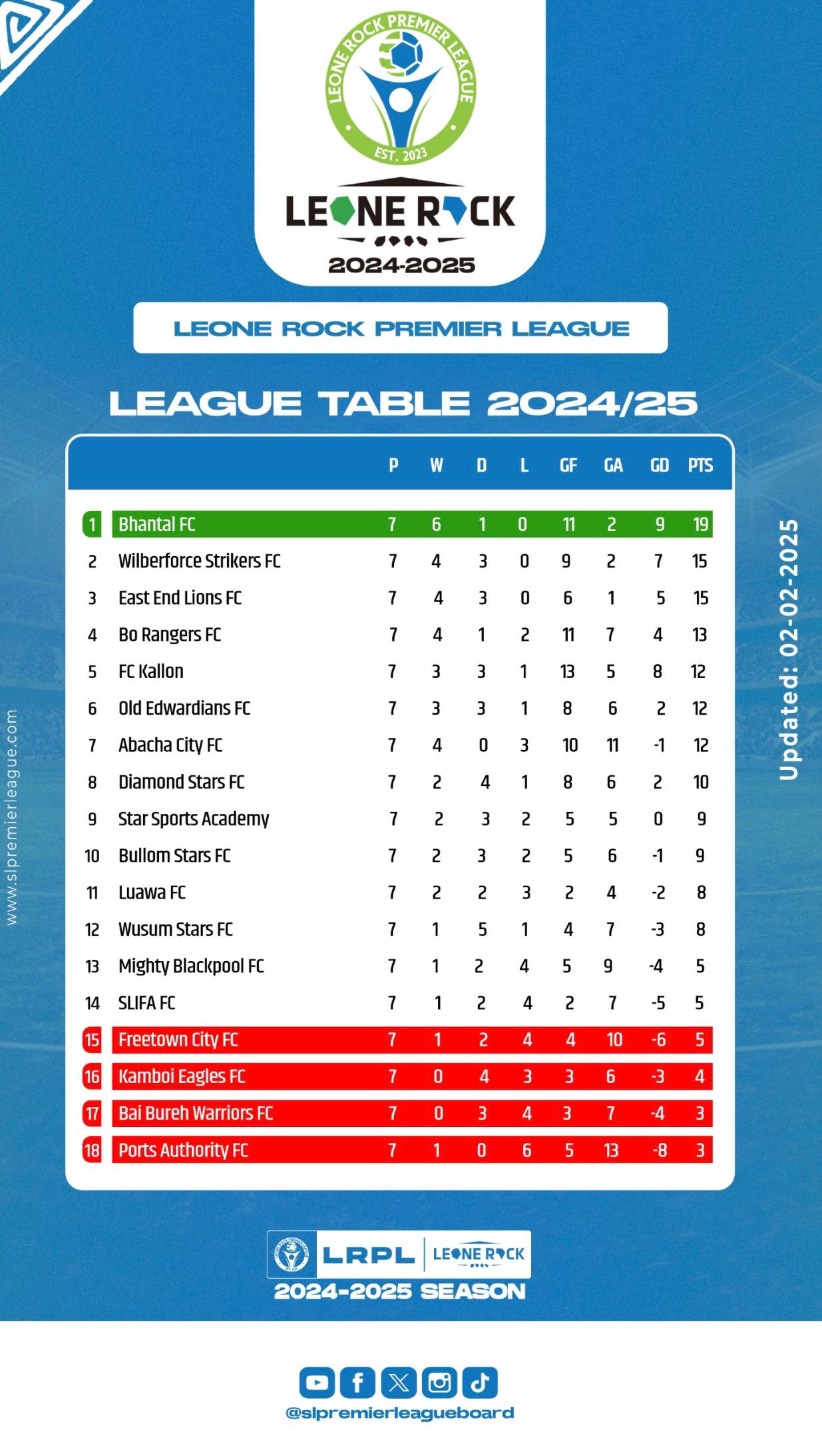 Bhantal FC continues to dominate the league with 19 points from six wins and a draw, establishing themselves as the team to beat this season. Wilberforce Strikers FC remains in second place with 15 points, while East End Lions FC and Bo Rangers FC are level on 14 points, keeping the title race wide open.