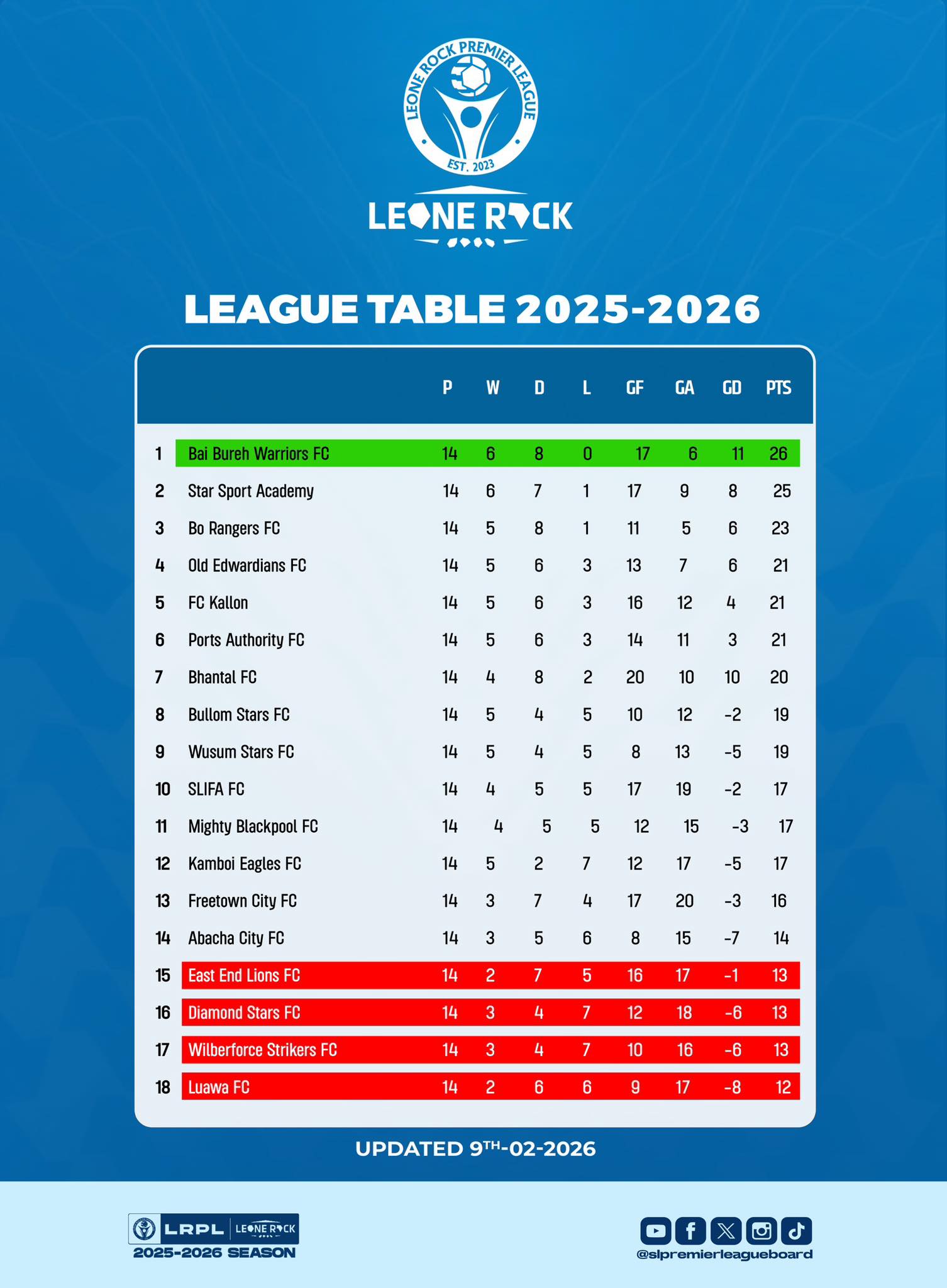 The Leone Rock Premier League Matchweek 14 concluded this week (February 4–9, 2026) with a series of tight defensive battles, pivotal away victories, and a reshuffling of the mid-table standings.