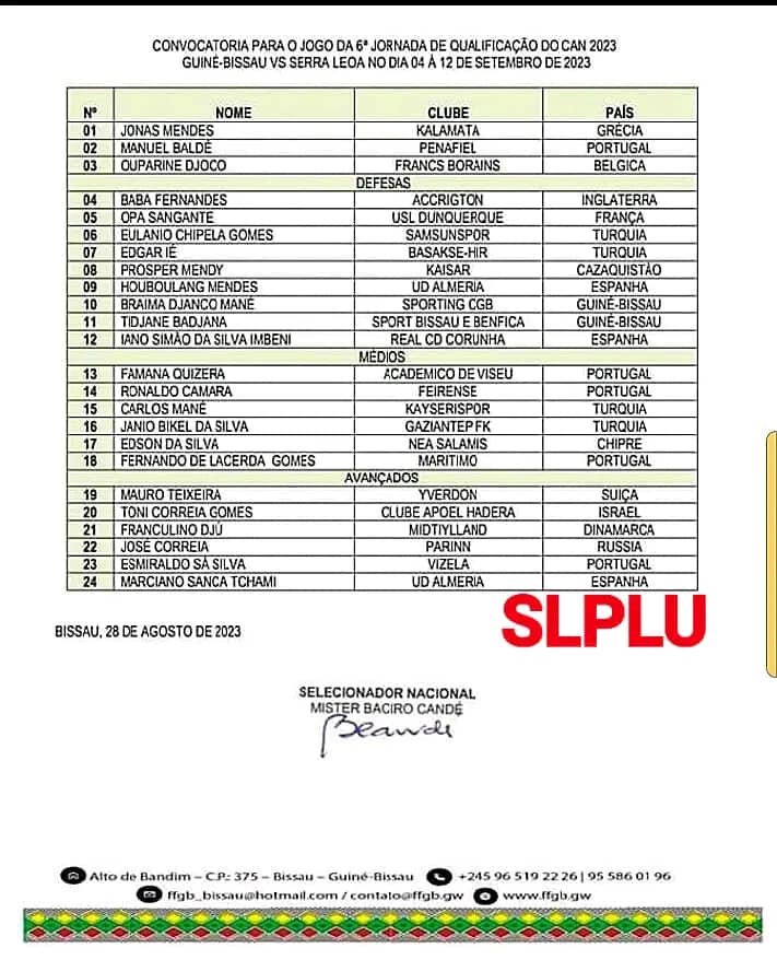 The Jurtus of Guinea Bissau have announced A 24 man squad list ahead of clash with Leone Stars of Sierra Leone on 11th September 2023 .