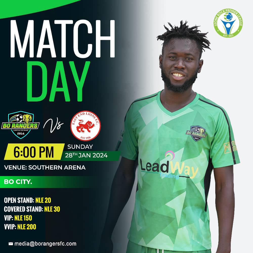 Bo Rangers Football Club will host East End Lions today, 28th January 2024 at the Southern Arena Stadium.