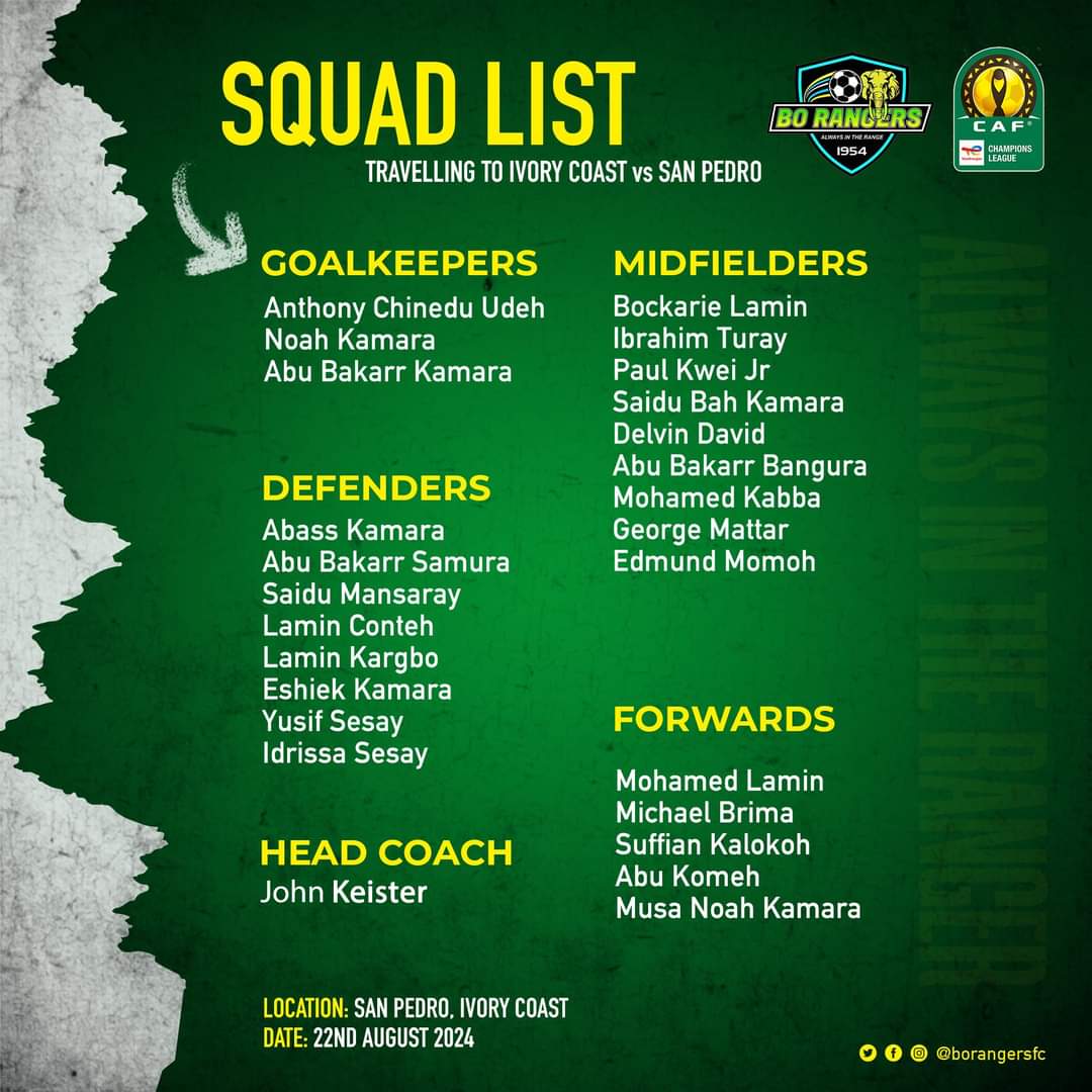 A delegation from Bo Rangers FC has departed for Ivory Coast this morning in preparation for their crucial CAF Champions League return leg match against FC San Pedro.