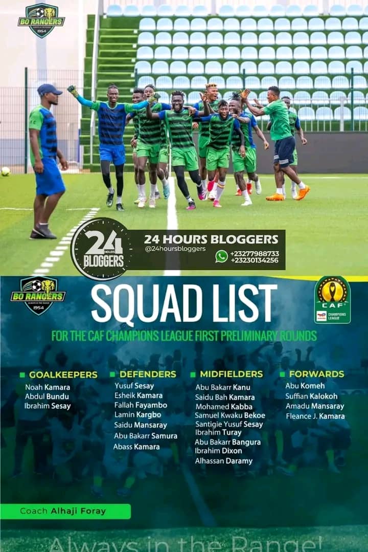 Bo Rangers FC Technical Team has officially announced their  23 man squad to face their opponent  LISCR in the second leg  of the CAF Champions League Preliminary round scheduled for  Sunday,  27th August 2023 at the Samuel Kanyon Doe Stadium.