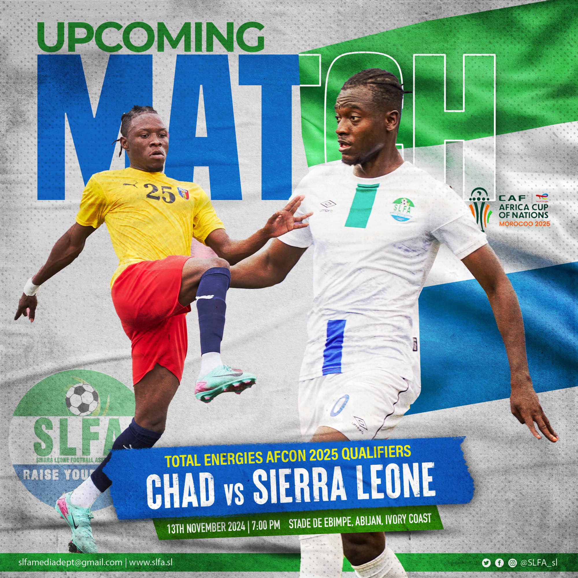 Sierra Leone’s national football team, the Leone Stars, are set to face Chad in a crucial 2024 Africa Cup of Nations (AFCON) qualifier today, November 13th, at the Stade de Epimbe in Abidjan, Ivory Coast. Kick-off is scheduled for 7:00 PM local time.
