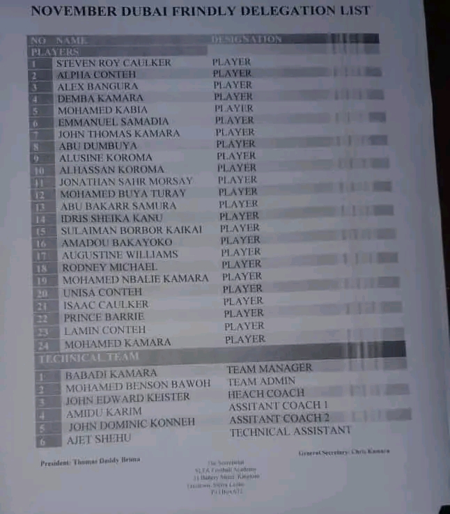 Amidst controversies over SLFA delegation list to Dubai, full list of the said delegation has surfaced online for public consumption. Below are the leaked names of players and officials mentioned in the delegation List of Leone Stars friendly matches in the United Arab Emirates.