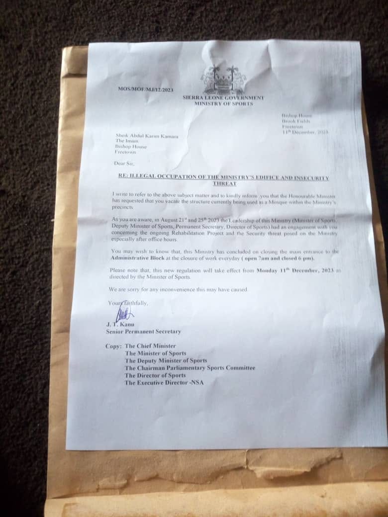 In recent times, there has been growing concerns from Muslim worshipers over a recent letter issued by the Ministry of Sports instructing Sheik, Abdul Karim Kamara and others to Vacate the structure being used as a Mosque within the Ministry of Sports Precincts at the National Stadium.