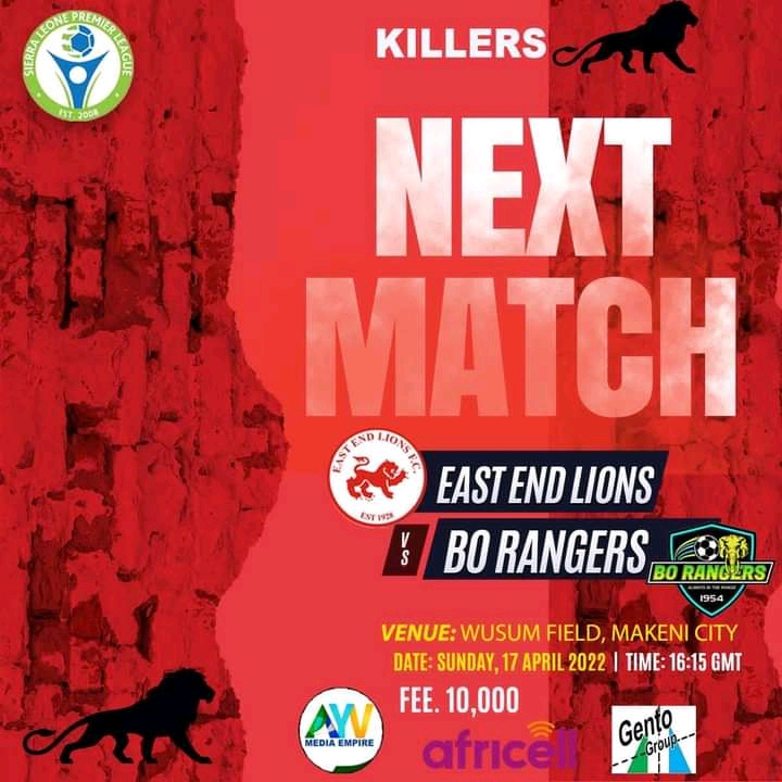 As they battle for the Sierra Leone Premeir League, East End Lions Football Set to clash with Bo Rangers at the Wusum field , Makeni City. The Match is schedule to take place on on Sunday 17th April 2022.