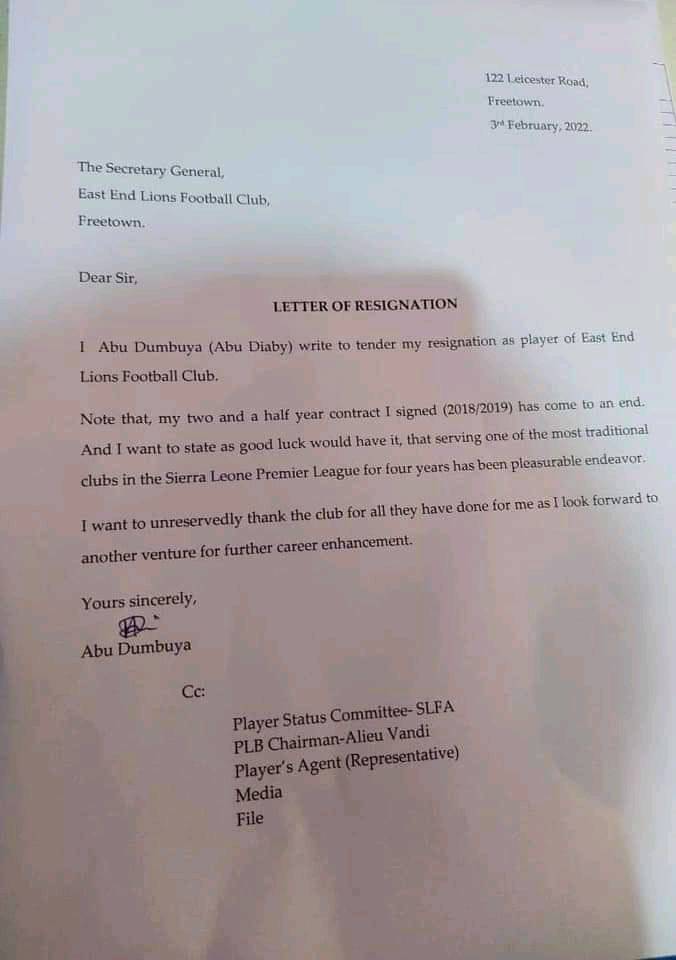 Leone Stars and East end Lions Midfielder Abu Dumbuya (Diaby) has pen down a letter of resignation to East end Lions Football Club after two and half contract with the Club.