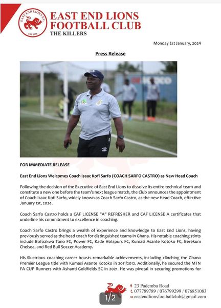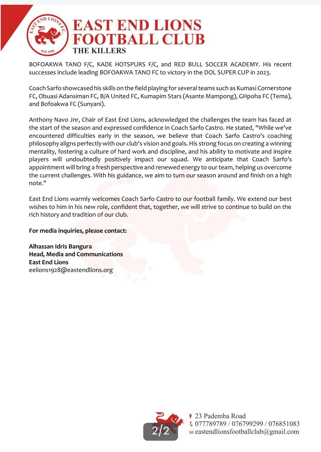 While we’ve encountered difficulties early in the season, we believe that Coach Sarfo Castro’s coaching philosophy aligns perfectly with our club’s vision and goals. His strong focus on creating a winning mentality, fostering a culture of hard work and discipline, and his ability to motivate and inspire players will undoubtedly positively impact our squad. We anticipate that Coach Sarfo’s appointment will bring a fresh perspective and renewed energy to our team, helping us overcome the current challenges. With his guidance, we aim to turn our season around and finish on a high note.” He stated.