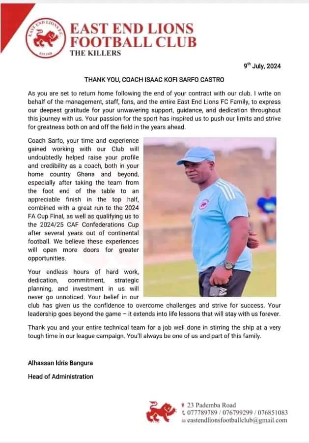 In a recent press release, East End Lions Football Club has officially parted ways with Coach Isaac Kofi Sarfo following the conclusion of his contract with the club.