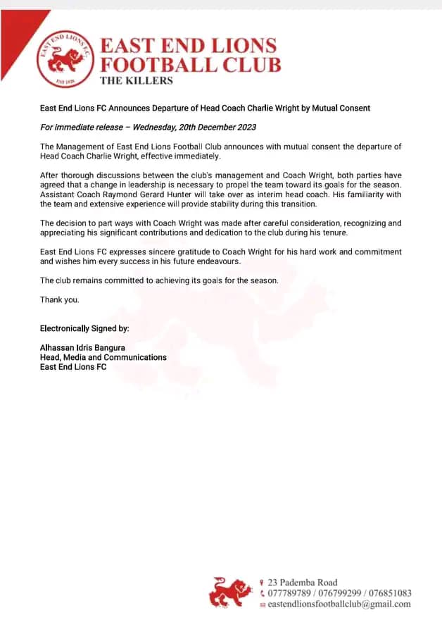 The management of East End Lions Football Club disclosed the amicable departure of Head Coach Charlie Wright, effective immediately, as confirmed in the club’s press release.