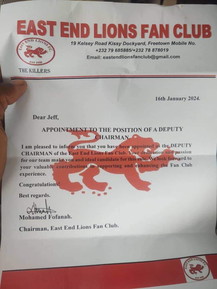 This appointment recognizes Komba-kono’s unwavering commitment to the East End Lions and his notable enthusiasm for the team. Fans anticipate that his role as Deputy Chairman will bring a fresh perspective and contribute to the vibrant atmosphere of the East End Lions Fan Club. Congratulations to Jeffrey Podolski Komba-kono on this well-deserved appointment!