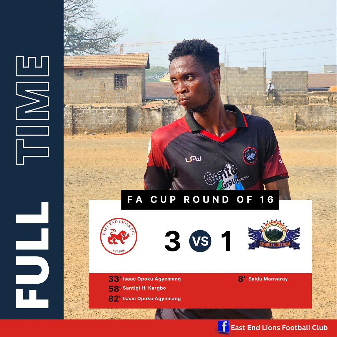East End Lions Football Club have advances to the FA CUP Round of 16, Quarter Final Spot after their 3-1 win Over Bullom Stars FC at the Trade Center field in Freetown.