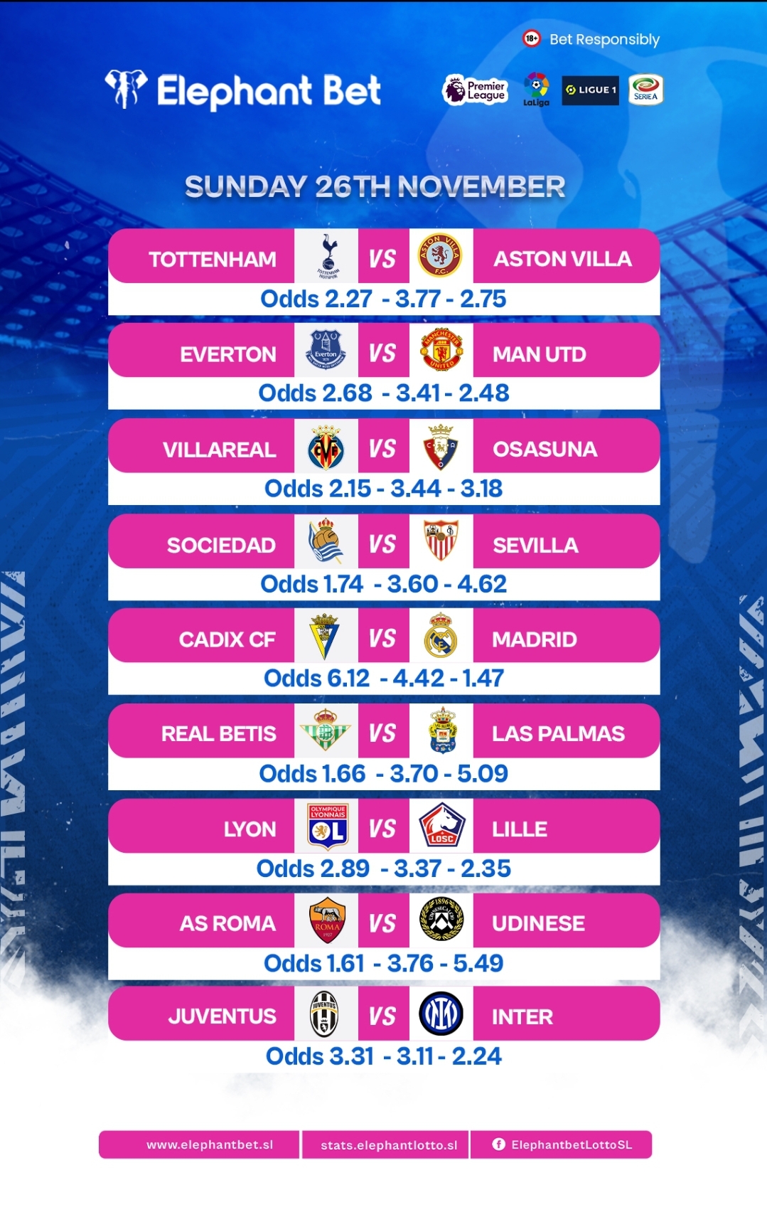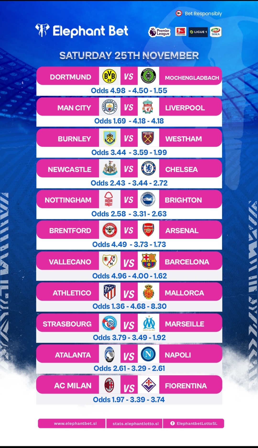 You can place your bets on the weekend fixtures either through the Elephant Bet App or by visiting the Elephant Bet site. Here are some odds for you to try your luck this weekend.”