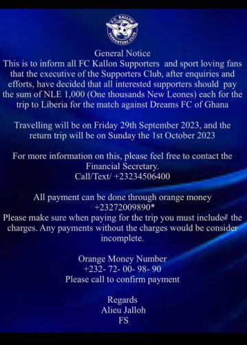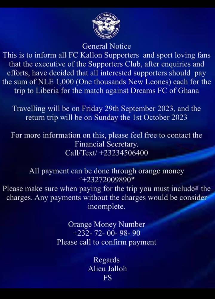 FC Kallon Supporters Club has informed supporters and sport loving fans that the executive of the supporters Club, after enquiries and efforts have decided that all interested supporters should pay the sum of NLE 1,000 [One thousand Leone New Leone] each for the trip to Liberia for the match against Dreams FC of Ghana