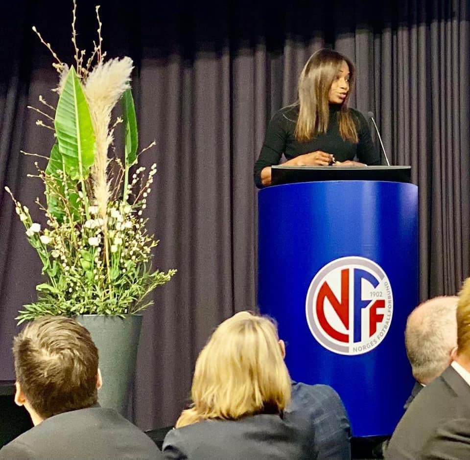 Isha Johansen representing Fifa, delivers a powerful speech today in Oslo at the Norwegian Football Federation Elective General Assembly.