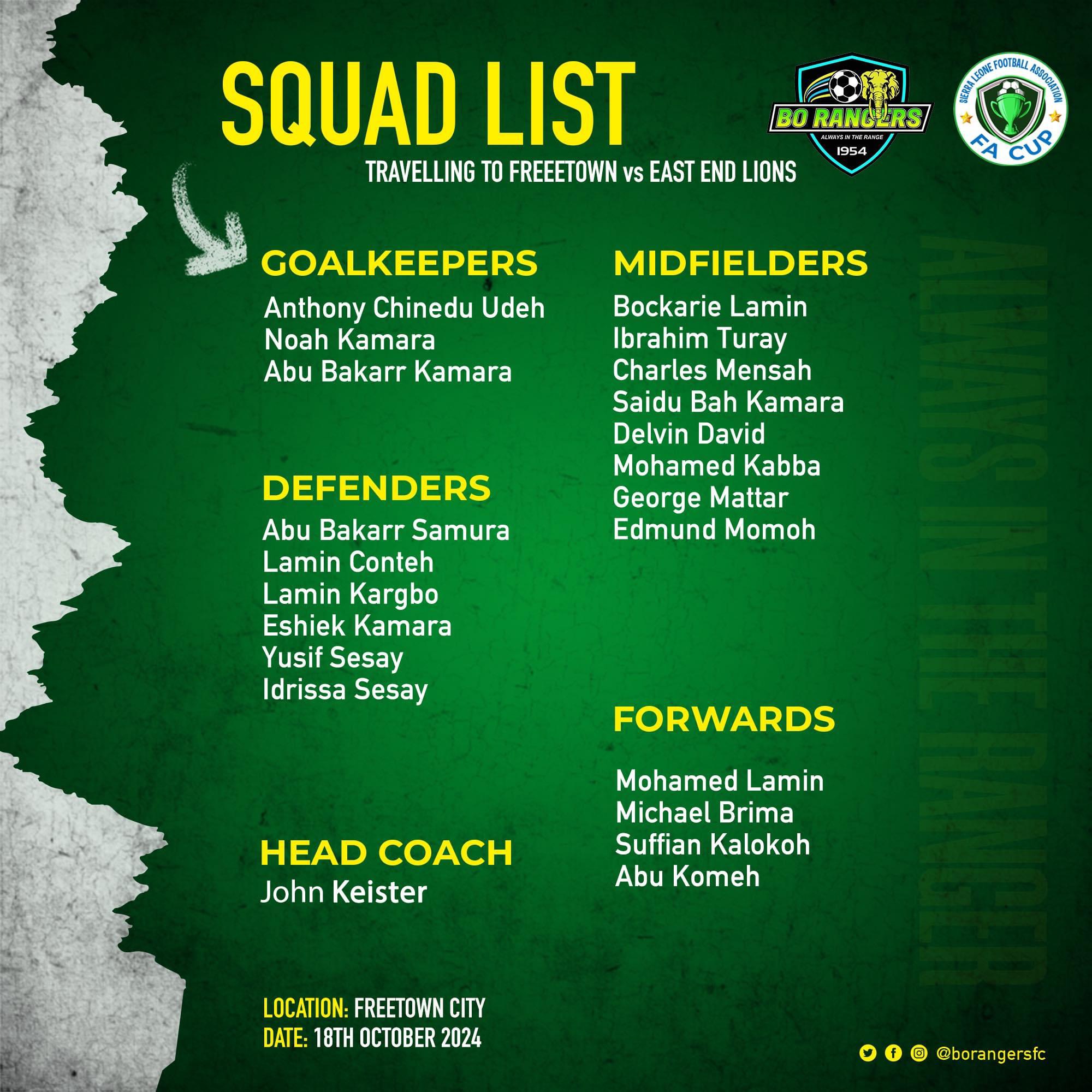 Bo Rangers Head Coach, John Keister released a list of the 21-man squad to face East End Lions in the FA Cup Final match scheduled for Saturday evening at the Sierra Leone Football Academy.