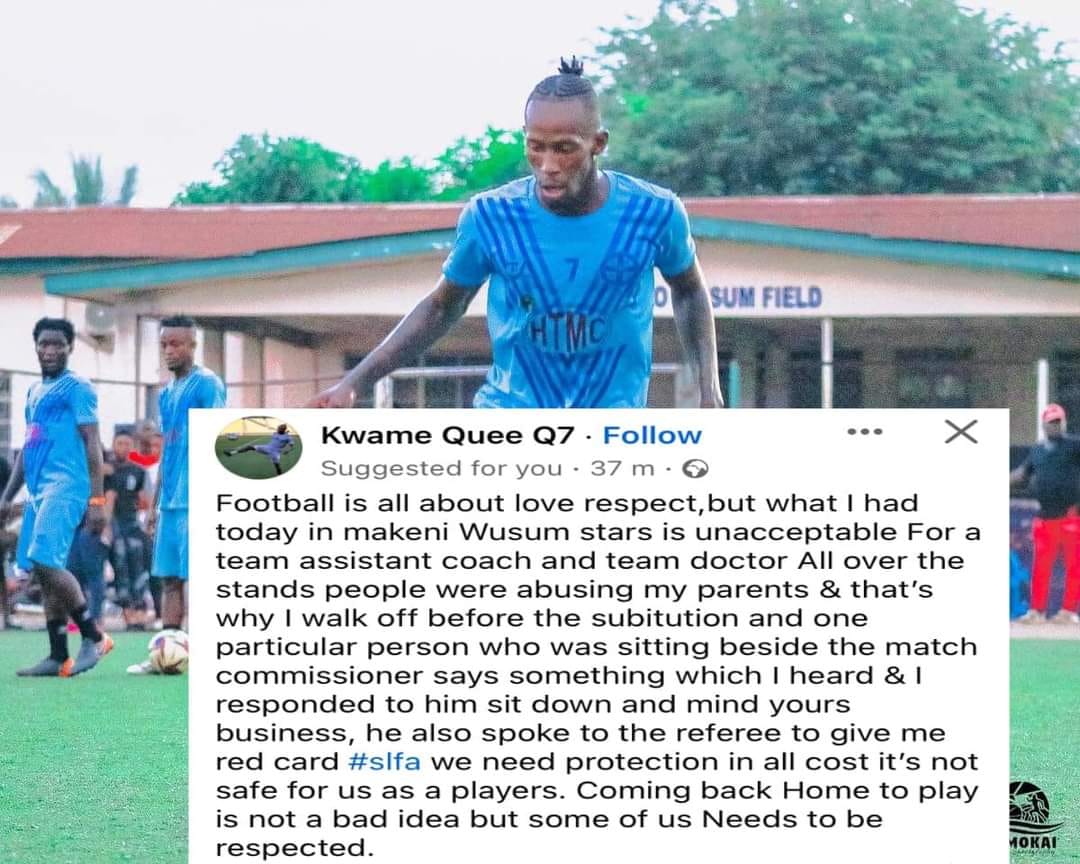 Reacting to the said incident, Quee posted “Football is all about love respect, but what I had today in makeni Wusum stars is unacceptable For a team assistant coach and team doctor All over the stands people were abusing my parents & that’s why I walk off before the substitution and one particular person who was sitting beside the match commissioner says something which I heard & I responded to him sit down and mind yours business, he also spoke to the referee to give me red card # slfa we need protection in all cost it’s not safe for us as a players. Coming back Home to play is not a bad idea but some of us Needs to be respected”