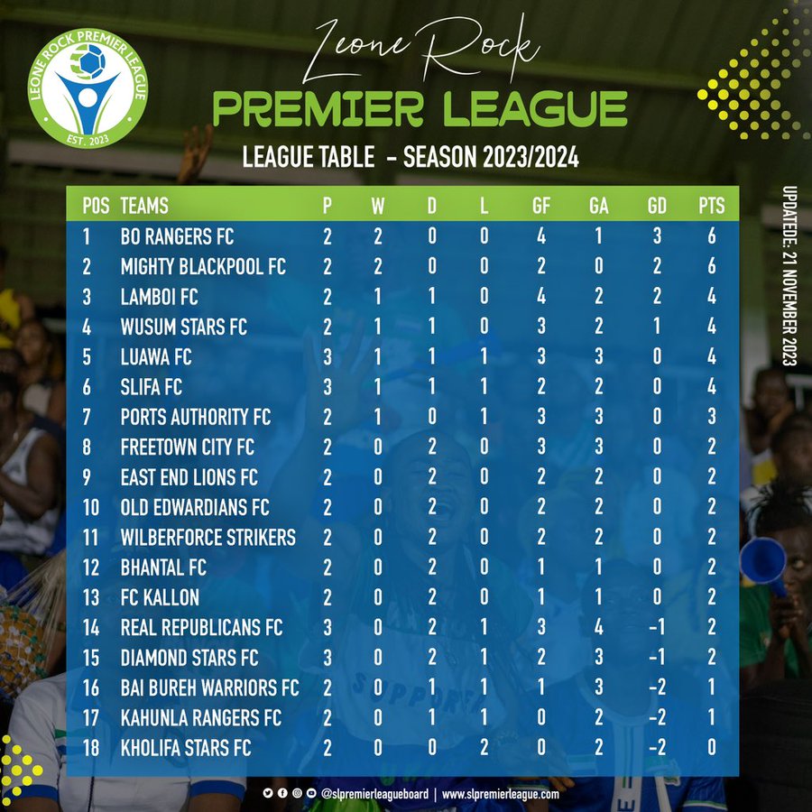 Bo Rangers have claimed the top spot with an impressive six points, closely followed by mighty Blackpool also on six points, with Bo Rangers holding a slight advantage in goal difference.