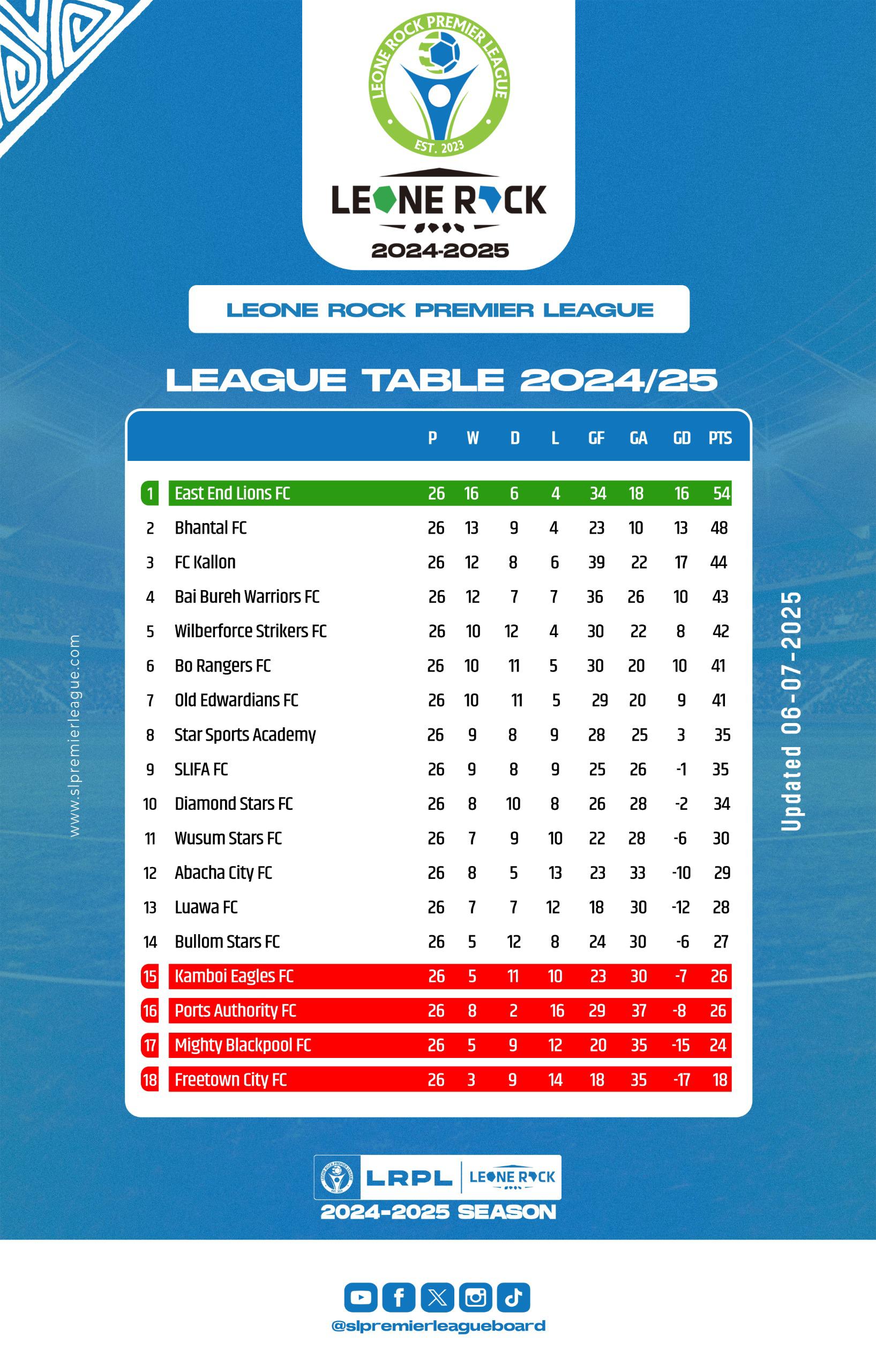 In the latest standings, Bhantal FC is position after East End Lions with 48 points on second place, followed by FC Kallon, which has 44 points at the third place on the table. The competition remains fierce, with Bai Bureh Warriors FC position on 4th place with 43 points, followed by Wilberforce Strikers FC on 5th position with 42 points.