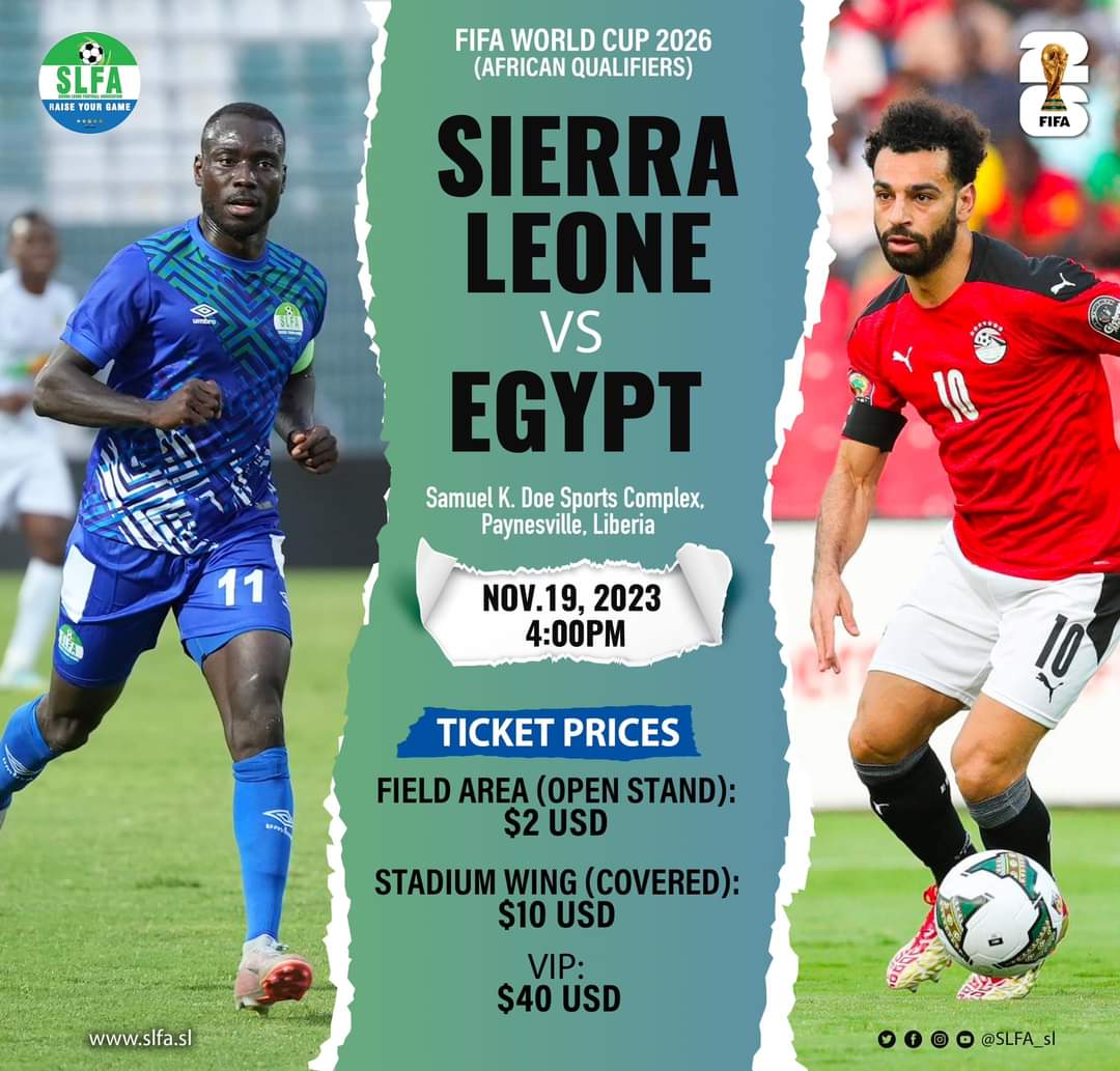 The Sierra Leone National Senior Men’s Team, Leone Stars, is set to face the Pharaohs of Egypt today, Sunday, November 19th, in Paynesville, Liberia.