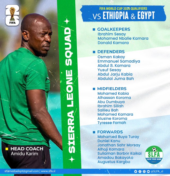 Leone Stars Head Coach Amidu Karim, on November 10, 2023, announced the squad for the 2026 FIFA World Cup Qualifying matches against Ethiopia and Egypt.